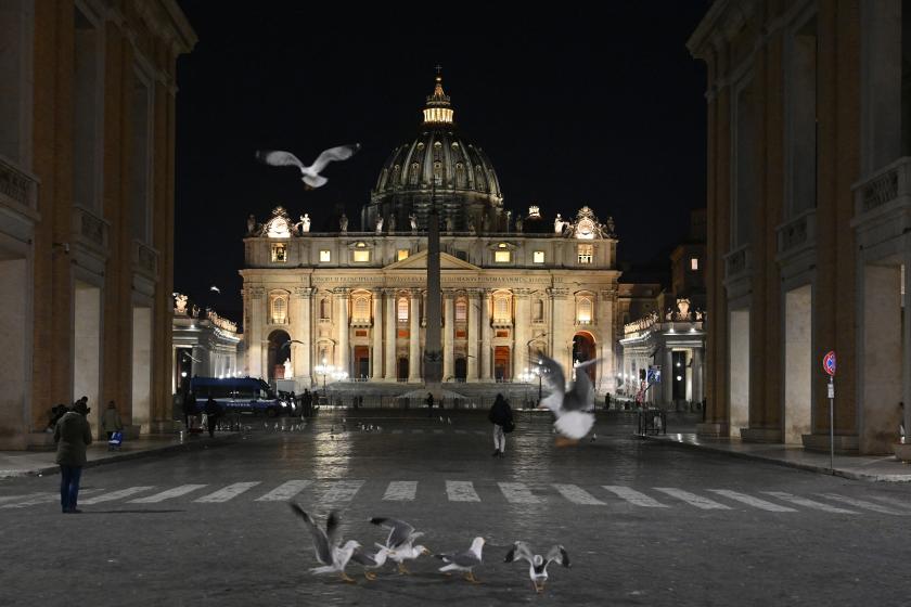 Vaticaanstad, 27 maart 2021 - De belichting van de koepel en façade van de Sint-Pietersbasiliek en de colonnade van het Sint-Pietersplein is vanavond een uur uitgeschakeld geweest. Dat is gedaan in het kader van Earth Hour, een klimaat- en milieubeschermingscampagne.