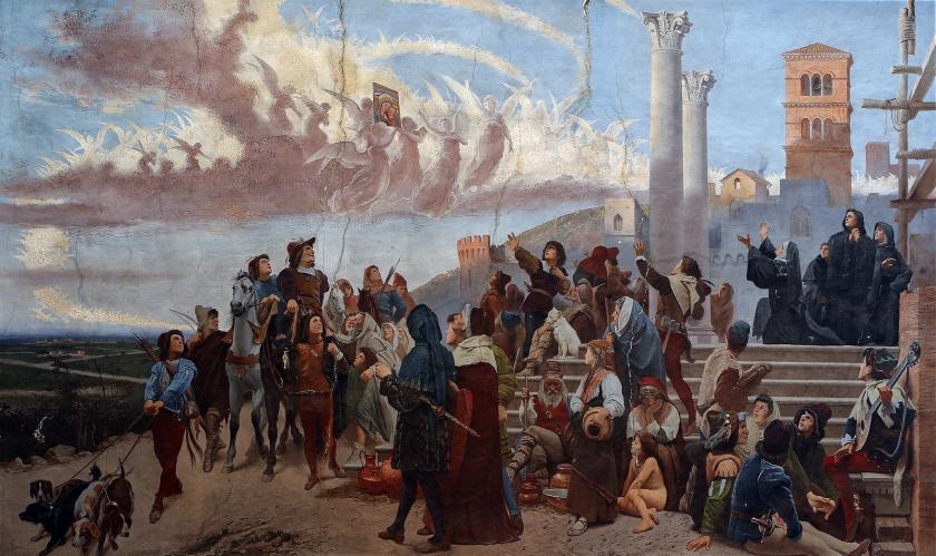 In de vijfde eeuw zou de kleine dorpsgemeenschap van Genazzano, 50 kilometer ten zuiden van Rome veel geld hebben ingezameld voor de bouw van de basiliek van Sant Maria Maggiore in Rome. In ruil daarvoor werd later in Genazzano een kerk gebouwd, waarvan de bediening sinds 1356 in handen was van de Augustijnen. In 1467, zo gaat het verhaal, zou – in de week van het apostelfeest van Sint Marcus – er uit de kerk opeens hemelse muziek geklonken hebben. Er zou vervolgens een wolk zijn neergedaald op een van de binnenwanden van de kerk. Voor het oog van het toegestroomde volk, trok de wolk weer op waardoor een fresco werd onthuld van de Heilige Maagd en Kind. Later werden nog meer wonderen aan de beeltenis, die Onze Lieve Vrouw van Goede Raad genoemd werd, toegeschreven. Genazzano werd daardoor een van de belangrijkste Maria-bedevaartsplaatsen van Italië.
