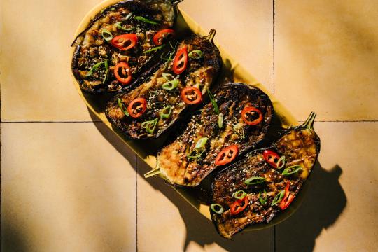 Koken met seizoensgroente aubergine: pasta, miso aubergine en van de barbecue