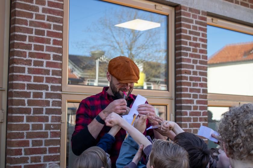 Na het voorlezen is het de beurt aan boswachter Tim om met de kinderen aan de slag te gaan. Samen met de medewerkers van IVN Natuureducatie laat Tim de leerlingen zien hoe je zaadbommen maakt. Dit doen ze door tuinaarde, klei, water en zaadjes met elkaar te mengen. Als de bommen af zijn, gaan deze in plaats van tegels de grond in.