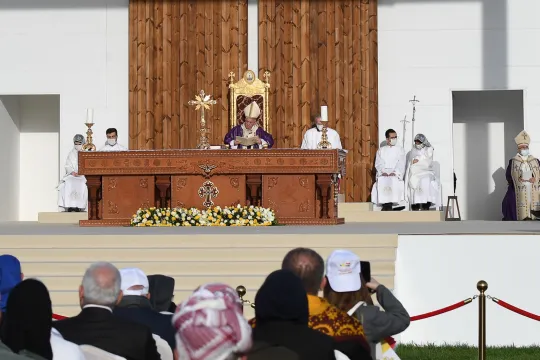 Erbil, 7 maart 2021 – Paus Franciscus is vanmiddag op de derde dag van zijn apostolische reis door Irak voorgegaan in een eucharistieviering in het voetbalstadion van Erbil, het bestuurscentrum van de Autonome Regio Koerdistan. Aan de zondagsliturgie namen enkele duizenden katholieken deel.