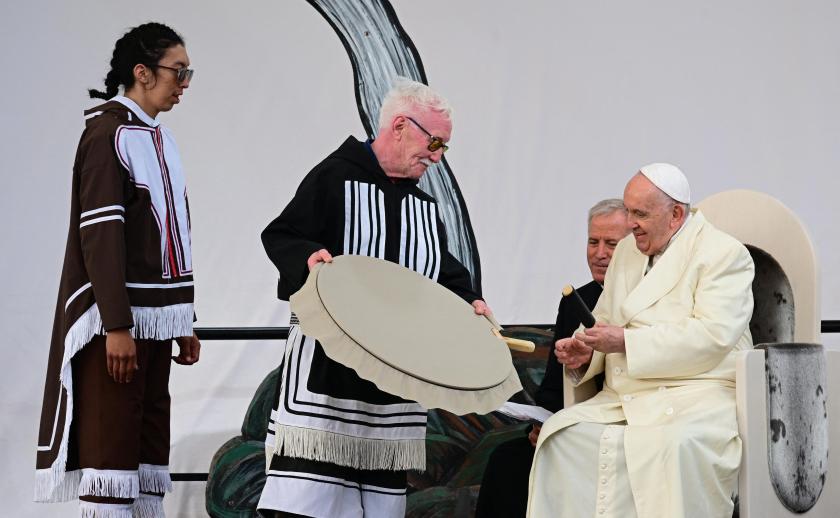 Rome, 30 juli 2022 - Paus Franciscus is vandaag weer in Rome teruggekeerd van zijn reis door Canada. De pontifex en zijn gevolg waren vertrokken vanuit de noordelijke stad Iqaluit waar hij aan Inuit excuses had aangeboden voor de onoirbare missionaire praktijken waaraan de kerk zich schuldig had gemaakt. In het vliegtug naar Italië veroordeelde Franciscus tijdens de gebruikelijke persconferentie het Indian Residential School System en noemde het alsnog genocide.