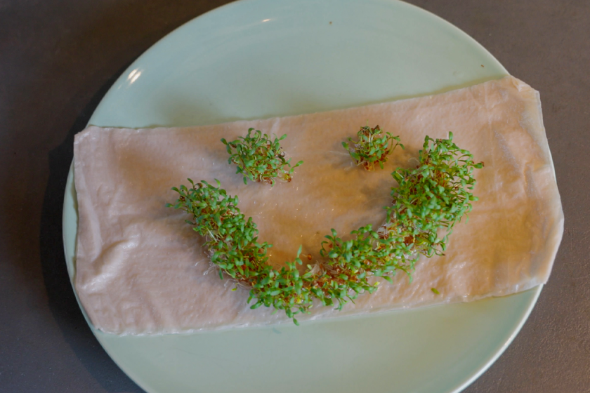 Je hebt niet veel nodig om kiemgroente te kweken, vertelt Anne: 'Je kunt een kiemschaaltje gebruiken, die zijn in veel winkels te koop. Maar je kunt ook keukenpapier gebruiken. Dan kun je hele figuren of zelfs namen zaaien.'