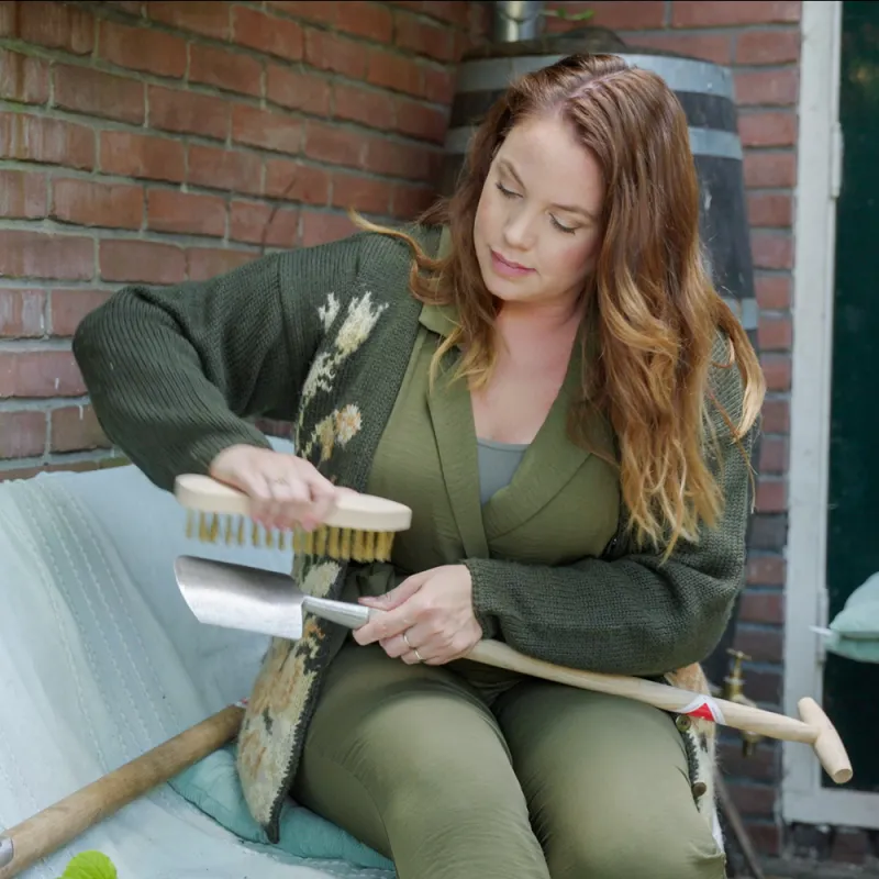 Maak je gereedschap eerst helemaal schoon, zodat alle aarde eraf is. Anne gebruikt een staalborstel voor haar spades en een messenslijper of wetsteen voor scharen.