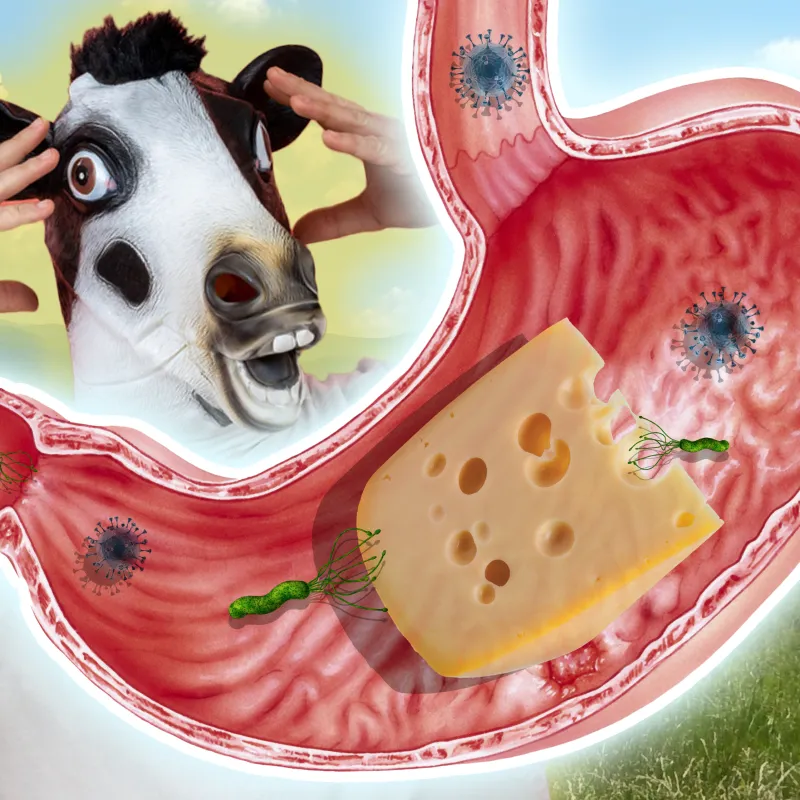 De melkklont in de tas van een dierenmaag is het begin van de kaasproductie. Mensen begonnen expres stremsel toe te voegen aan melk om kaas te maken. En als je verschillende soorten stremsel toevoegt aan melk, ontstaan er verschillende soorten kaas. Tientallen of misschien zelfs wel honderden unieke smaken en texturen! Tegenwoordig wordt kaas nog steeds op dezelfde manier gemaakt als duizenden jaren geleden. Maar het proces is nu wel wat makkelijker, want de kaas die je in de supermarkt koopt, komt gewoon uit een machine. Zo heb je in je lasagne een mooie combinatie tussen wetenschap en ambacht.