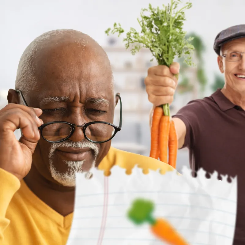 Als je een bril draagt, heeft het weinig nut om nu ineens enorm veel wortels of producten te eten die rijk zijn aan vitamine A. Bijziendheid of verziendheid komt door een afwijking aan je oog. Dit los je niet op met wat extra oranje snackgroenten.