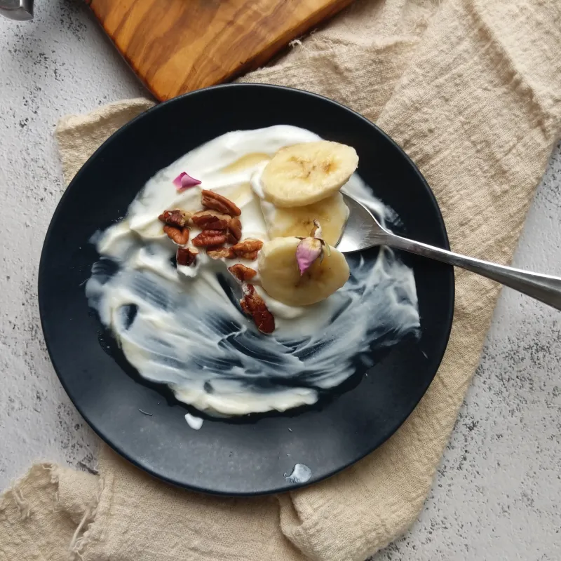 - Een paar flinke lepels yoghurt (Het kan met iedere yoghurt, dierlijke of plantaardig. Kies er een die je lekker vindt qua dikte en structuur)