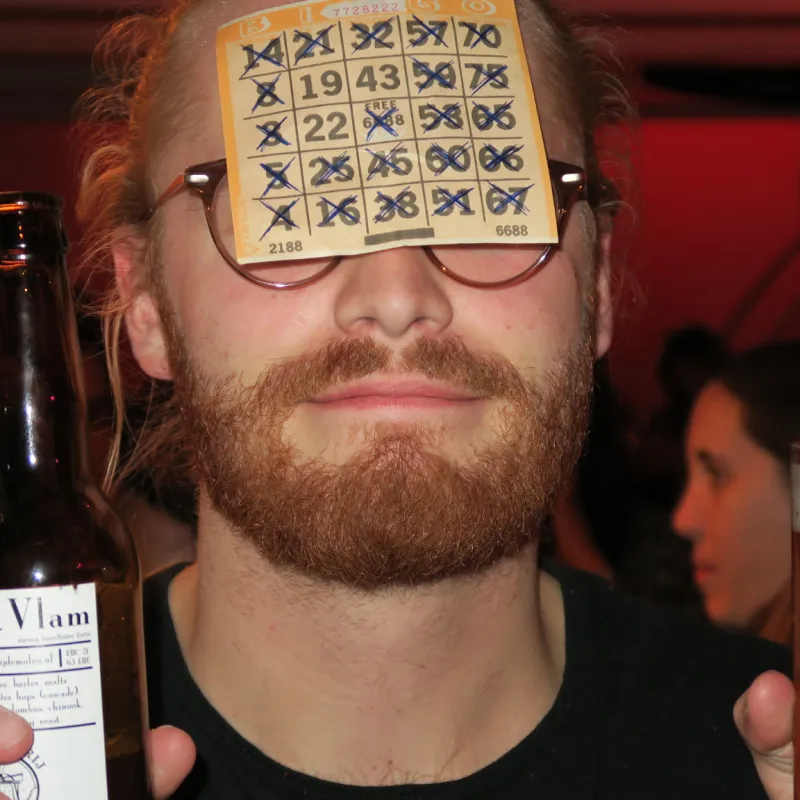19.50 u: Mijn vriendin komt paniekerig de bar binnen. “Is het al begonnen?”, vraagt ze. “De bingokaarten zijn nu te koop”, zegt Wilbert door de microfoon. “1,50 euro per stuk”. Ik koop twee bingokaarten. Anderen die binnendruppelen zetten hun spullen weg op het podium: een boek over afvallen dat ‘Fit of Vet’ heet, een plastic kerstboom, een dvd met een natuurfilm, een treurige kamerplantje met zo te zien enkele plantenziektes, waxinelichtjeshouders, een roze glitterpet, een fors decoratief bord met daarop het recept voor vriendschap (‘1 pint of trust, 1 dash of caring’, etc.), en meer dingen die inderdaad als ‘zooi’ te classificeren zijn.