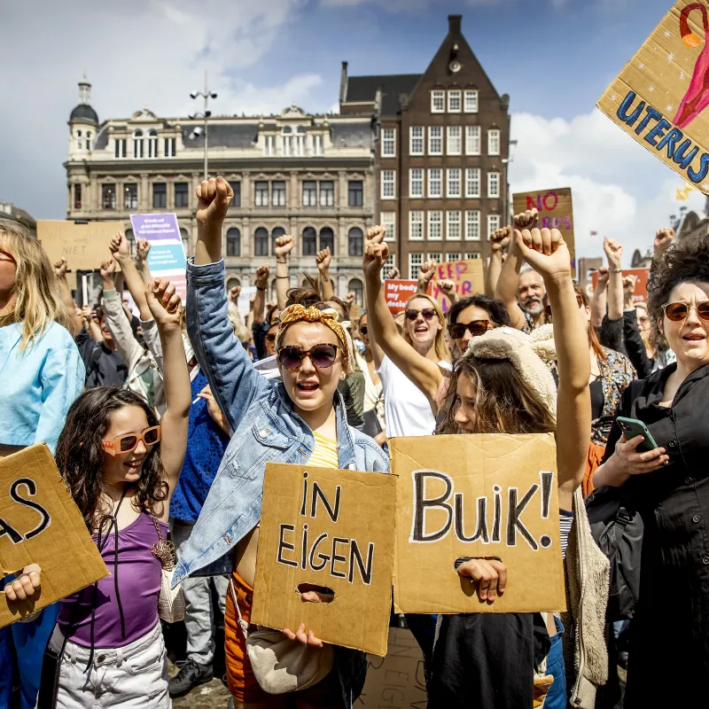 Foto: ANP | Demonstranten tijdens een solidariteitsdemonstratie voor het abortusrecht op de Dam. Aanleiding voor de demonstratie is het nieuws van deze week dat in de Verenigde Staten mogelijk het federale abortusrecht wordt afgeschaft.