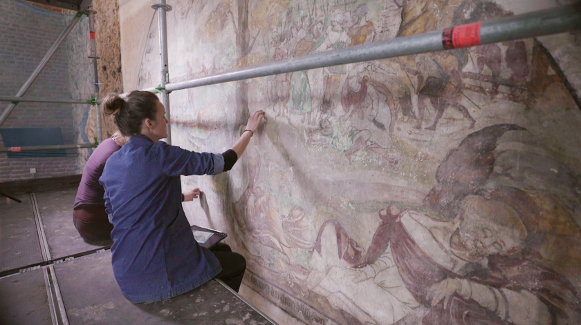 Aafje Bouhuis en Nanon Journée staan op een duizelingwekkend hoge stijger in de Lebuineskerk in Deventer, de kerk die de skyline van de IJsselstad zijn kenmerkende aangezicht geeft. Aafje en Nanon zijn gespecialiseerd in de conservatie van muurschilderingen en werken hier aan een wandschildering uit 1550. Na een paar maanden zal de afbeelding van Het Laatste Oordeel weer voor een volgende generatie bewaard zijn gebleven. Ze doen hun werk met bezieling, zegt Aafje: ‘Een kerkgebouw is een bijzondere en betekenisvolle plek om te werken. Daar gaat het om iets dat groter is dan ikzelf.’